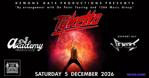 Οι θρυλικοί Tyketto, ένα από τα πιο αγαπημένα και επιδραστικά συγκροτήματα του melodic hard rock των ’90s, θα εμφανιστούν στην Αθήνα το Σάββατο 5 Δεκεμβρίου 2026, στο Piraeus Academy, για μια ξεχωριστή συναυλία που αναμένεται με μεγάλο ενδιαφέρον από το ελληνικό κοινό.